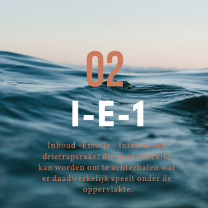 Als er – zwakke of sterke – emoties spelen, kunt u ervan op aan dat u dicht bij de kern zit waar het iemand om gaat: een belang of behoefte dreigt namelijk overschreden te worden. Gebruik daarom de interventie I-E-I om te achterhalen wat er speelt. De drietrapsraket I-E-I bestaat uit de volgende vragen: